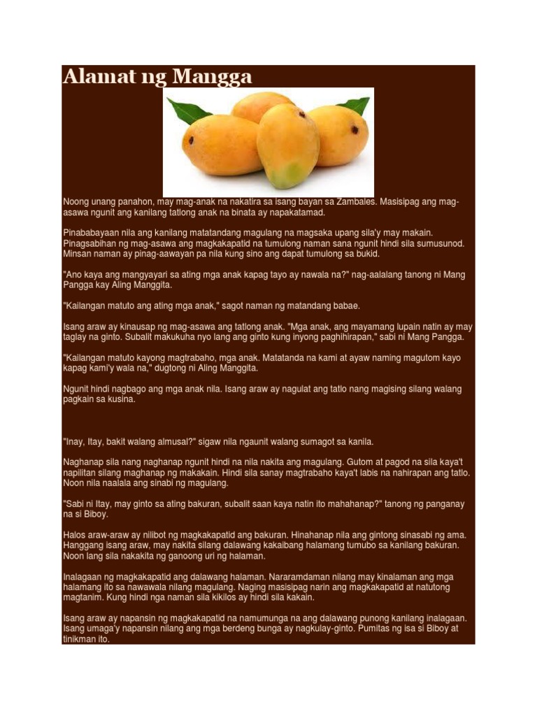 Nagmana siya sa kanyang mga magulang na mababait din naman. Ang Alamat ng Mangga Kaisa-isang anak nina Aling Maria at Mang Juan si Ben. Alamat ng Mangga book.