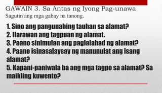 Linangin Magbabasa ka ng isang alamat upang maunawaan mo kung paano ito naiiba sa iba pang uri ng panitikan. Kung ako ang may akda ay tatapusin ko sa paraang kung papaano tinanggap ng prinsesa ang kanyang sinapit kay Prahnbun.